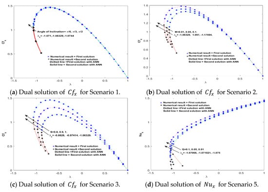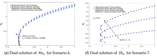 The smart solution of flow behavior is obtained with AI-based LMS-BPNN for velocity (), temperature (), and concentration () profiles of Eyring–Powell fluid over a porous shrinking wedge. AI-based learning is crucial to handle the flow stability of shrinking and stretching surfaces. The MATLAB toolbox of ANNs (‘nftool’ command) is used to train the network for , and to observe the effects of varying the physical parameters as in Table 1 (Scenarios 1–7). In this analysis, the author focus on thermo-physical properties of flow over a shrinking wedge. The effects of different pertained parameters are investigated, and a dual solution is obtained for various scenarios as shown in Table 1 with and remaining constant (see Ref. [39] for fixed parameters). The dual solution for flow output responses are shown in Figure 7(a–f) for different values of the pertained parameters as in Scenarios 1–7. The predicted solution with LMS-BPNN is obtained for different values of with , , , , , , , , and (as shown in Figure 7a. The values of these parameters are considered Ref. [39]). Figure 7b shows that the solution changes its nature at critical values , , for various values of magnetics effects as shown in Scenario 2 ( with , , , , , , , and remaining constant (the values of these parameters are considered Ref. [39])). It is also important to declare that with the increment in the value of then the solution bifurcates at maximum values of . Similarly, Figure 7c shows the impacts of porosity parameters on . The solution bifurcates for at critical values , , . Figure 7c shows that when we increase porosity parameters, then the critical values change from to . Figure 7d,e shows the effects of and on heat transfer coefficient. In Figure 7f, we observe the impact of on . It is examined that the critical values remain the same for Scenario 7 Cases 1–3. From Figure 7, it is concluded that the flow response outcomes (, , ) have a dual nature. Figure 8a depicts the effects of the angle of inclination () on and it is noted that the boundary layer thickness for the second solution is higher than the first solution. Figure 8b,c show the impact of Scenarios 2–3 on . It is observed that when we increase the value of then the first solution of increases and the boundary layer thickness of the second solution increases. The dual solution is calculated at with , , , , , , , and (the values of these parameters are considered Ref. [39]). Similarly, the porosity parameter (mentioned in Scenario 3) has a similar fashion to that in Scenario 2. With the enhancement in the porosity parameter, the velocity of the non-Newtonian fluid (Eyring–Powell fluid) increases. The impacts of Scenario 5 are displayed in Figure 8d. This figure shows the effects of on the temperature profile. Figure 8e shows the dual solution of the concentration profile against . The dual solutions are calculated for , , and with LMS-BPNN for variation in physical parameters for different scenarios as shown in Table 3. The non-unique nature of the solution is investigated by a vertical line test. This test shows that if a vertical line draws on a graph and it intersects at two points then the solution is non-unique. It is noted that the first and second solutions exist for , at a unique solution exists while there is no solution for (‘’ represents the critical value).