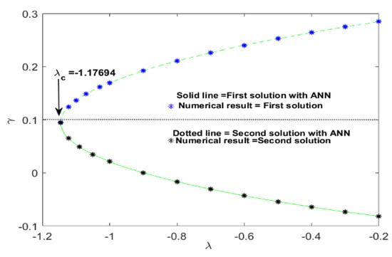 To test the stability of flow behavior, use the regular perturbation expansion to evaluate the eigenvalue (see References [46,47]). Many more researchers use the same concept to study the stability of the boundary layer flow over the shrinking surface: [48,49,50,51]. Consider, , , and , see Merril et al. [52]: