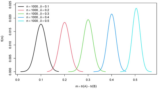 The estimates for the eigenvalues and traces of matrices and are as follows: and , respectively. With these trace values, we can compute the accuracies of the two classifiers: . According to this criterion, it seems that classifier A outperforms B. However, without sufficient information, we cannot conclusively determine whether this superiority is genuine or merely a result of chance. By analyzing the distribution of the difference between the two traces, as shown in (30) and (31), we can quantify the extent to which classifier A is superior to classifier B. Therefore, the probability that classifier A genuinely outperforms B is given by