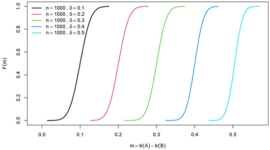 Graphs of the of for the difference of two traces of random confusion matrices for different effect size .