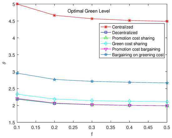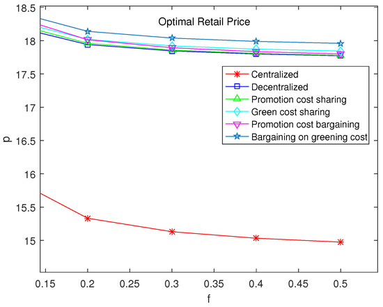 In summary, it can be obtained that . The conclusion is that the cost-sharing contract for greening improvement can improve the green level compared with decentralized decision making. It is possible that consumers are more willing to buy green products, despite a high level of greenness leading to higher product prices. Therefore, the cost-sharing contract remains effective.