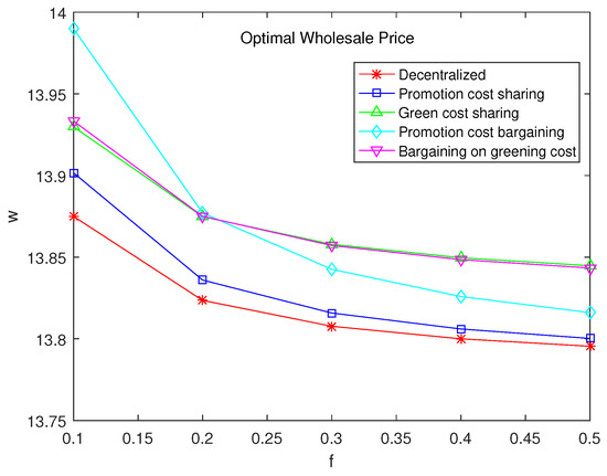 As implied by the conclusion, the wholesale price of products under the cost-sharing contract for greening improvement is higher than under decentralized decision making. This may result from the increase in the green cost of the product that causes the wholesale price to rise.