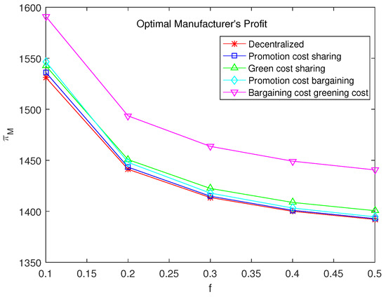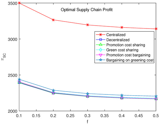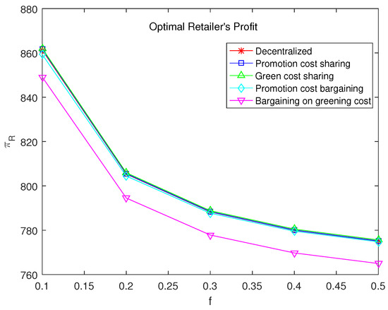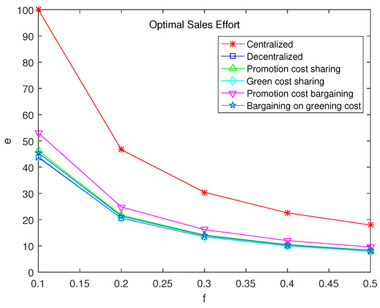 From the previous section, it can be seen that despite some relationships determined between parameters, it remains difficult to draw comparison in the complex formula of . To further reveal the impact of parameters on the supply chain, numerical experiments are conducted on the models in this section. The values of parameters are set within a feasible range to ensure the effectiveness of numerical experiments (refer to [23]). The parameter settings are as follows: , , , , , . The main focus of study is the impact of sales effort cost coefficient f on other decision variables. According to a series of numerical tests, the impact of f on decision variables is minimal when f exceeds 0.5. Therefore, f ranges between 0 and 0.5.