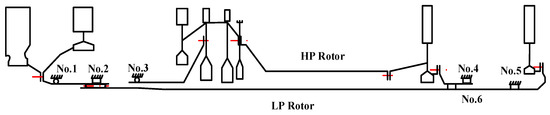 In the equation, , , and represent the mass, stiffness, and damping matrices of the entire system, respectively. and represent the gyroscopic matrices of the LP and HP rotors, respectively. and are the rotational speeds of the LP and HP rotors, respectively. , , and represent the displacement column vector, velocity column vector, and acceleration column vector of the entire rotor system, respectively. If solving for the dynamic response of the system, , , and will encompass the displacements, velocities, and accelerations of all nodes in all degrees of freedom. It is important to emphasize that, because rigid disk elements are used in this study, considering only the mass and gyroscopic moment of the disk without considering deformation. Therefore, the displacement of the disk is equivalent to the displacement of the nodes on the shaft.
