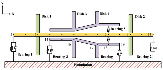 Based on the finite element method (FEM), the dual-rotor system shown in Figure 2 is divided into multiple simple and uniform finite sub-elements through virtual segmentation. Nodes are defined in each element, and the displacements of these nodes are used to represent the displacements of any micro-element in the element. Through this operation, the continuous system with infinite degrees of freedom is simplified into a system with finite degrees of freedom. The low-pressure rotor is divided into 12 beam elements, each with a length of 50 mm, and 13 nodes in total due to the shared nodes between elements. The high-pressure rotor is discretized into five beam elements with six nodes in total. The lengths of the first, second, fourth, and fifth beam elements are 50 mm, while the third beam element’s length is 100 mm. All disks are simulated using 4-DOF rigid disk elements with mass eccentricity, and all bearing support components are simplified using linear spring-damping elements.