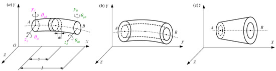 Three types of beam element models: (a) traditional beam element, (b) hollow beam element, and (c) variable-section hollow beam element.
