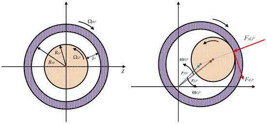Figure 5 illustrates the stable operation of the high and LP rotors and the occurrence of inter-shaft rub impact, where the two shafts come into contact with each other. In the stable operating state, the initial clearance between the two rotors is , where and are the radii of the LP rotor and the inner radius of the HP rotor, respectively. and are the rotational speeds of the LP and HP rotors, respectively. When rub-impact occurs, and are the precession motion radii of the LP rotor and the HP rotor, respectively. In this paper, these two quantities are vectors, as shown in Equation (7). and are the displacements of the rub point of the LP rotor in the z and y directions, respectively, while and are the displacements of the rub point of the LP rotor in the z and y directions, respectively. and are their respective precession angular velocities. To accurately depict the kinematic mechanism under this condition, the linear model and Coulomb friction model are used to simulate the variation of forces during the rubbing process, leading to the derivation of Equation (8).