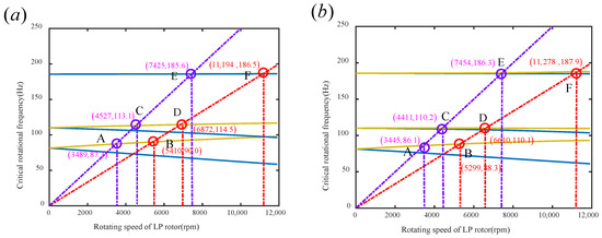 Figure 6 shows the Campbell diagram of the dual-rotor system. In the diagram, the red line represents the LP synchronous excitation line, the purple line represents the HP synchronous excitation line, the blue lines represent the various orders of reverse whirl frequency lines, and the yellow lines represent the various orders of forward whirl frequency lines. The intersection of the excitation lines and the dynamic frequency lines corresponds to the system’s critical speeds. Define the speed ratio between the HP and LP rotors as . When the HP and LP rotors rotate in the same direction, . When they rotate in opposite directions, . In this paper, it is assumed that under the condition of same-direction rotation and under the condition of opposite-direction rotation. The critical speed values vary under different rotation conditions, indicating an influence of the rotor system’s mode when there is an inter-shaft bearing between the two rotors. Figure 6a depicts the Campbell diagram of the system when the two rotors rotate in the same direction. The first critical speed point, labeled as A, is caused by the unbalance of the HP disk, while the first critical speed point B is caused by the unbalance of the LP disk. Similarly, the second critical speed points, labeled as C and D, are caused by the unbalance of the HP and LP disks, respectively. The third critical speed points, labeled E and F, are also caused by the unbalance of the HP and LP disks, respectively, as shown in Figure 6b and similar diagrams. The specific critical speed data are presented in Table 2.