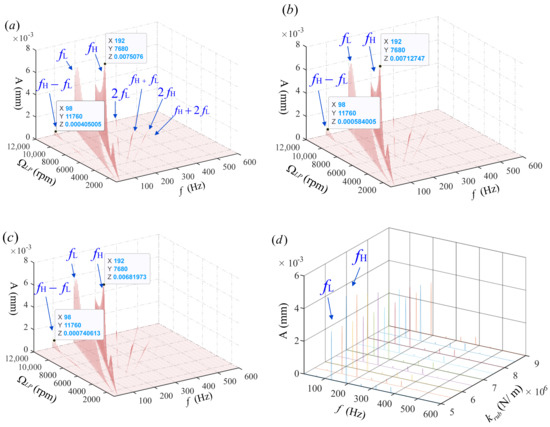 To investigate the influence of rubbing stiffness on the vibration characteristics, three different rubbing stiffness values, , , and are selected to calculate the system response during the acceleration process, with a friction coefficient of . Figure 7 and Figure 8, respectively, depict the waterfall plots of the response at the disk3 position under the influence of rubbing stiffness for the and conditions. When the speed ratio is , it can be observed that there are two prominent frequency amplitudes in all three operating conditions, and , which are the rotational frequencies of the LP and HP rotors. In the absence of rubbing, the system exhibits only these two frequency components. The amplitude at the reaches its peak near the third critical speed of rpm caused by the HP rotor. When the rub-impact fault occurs, with the increase of the rub-impact stiffness, the peak amplitude shifts noticeably to higher speeds and decreases. Considering the fault as part of the system structure, increasing the rub-impact stiffness is equivalent to increasing the system stiffness, resulting in the shift of the critical speed. It also has a certain inhibitory effect on high-frequency vibration displacement. In addition to the dual-rotor rotation excitation frequency, there are also a small number of other harmonic and combination frequency components. These frequencies are mainly multiples of the LP rotor excitation, as indicated in Figure 7a. As the rubbing stiffness increases, the amplitudes of the other harmonic components increase, except for the excitation frequency of the HP rotor, with the component showing the most significant increase. Figure 7d shows the waterfall plot of the displacement of disk3 as the rub-impact stiffness changes when . From this plot, it is more evident that decreases as the rub-impact stiffness increases. When the speed ratio is , and still dominate. This is the same as when . Increasing the rubbing stiffness leads to a decrease in the amplitude of , and the same applies to other frequency components. The difference lies in the fact that, under counter-rotation conditions, the overall amplitude of is lower than that under co-rotation conditions, while is generally higher, indicating more severe vibration of the HP rotor. The amplitudes of other harmonic and combination frequency components also increase with an increasing rubbing stiffness, but the peak amplitude of shifts noticeably and increases significantly compared to the co-rotation condition.