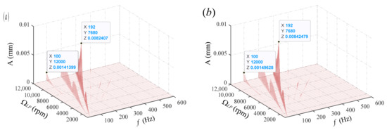 Full-spectrum diagrams of disk2 at different speeds when : (a) rpm and (b) rpm.