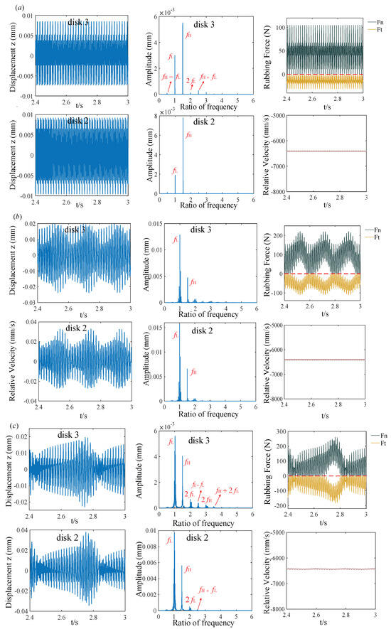 In this model, the HP-compressor disk (disk3) is located close to the rubbing position, leading to a more pronounced response that can significantly reflect the system’s dynamic behavior under fault conditions. The magnitude of the rubbing excitation directly determines the amplitude of the system’s response. According to the derived rubbing force Formula (6) in Section 2.2, the magnitude of the normal collision force is mainly related to the rubbing stiffness , while the magnitude of the tangential friction force is mainly influenced by the friction coefficient . This section will analyze the effects of these two parameters on the system’s vibration characteristics.
