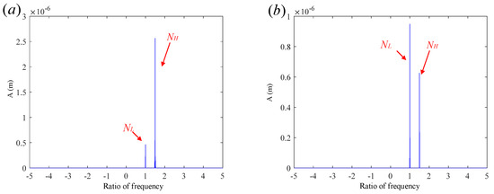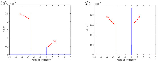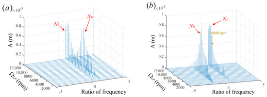 To verify the feasibility of this method, a whirl direction analysis is conducted on a system with unbalanced excitation only. Figure 12 shows the full-spectrum waterfall plot of the LP-turbine disk2 for the high-low rotor-speed ratio of and . When there is no rub impact, the frequency components in Figure 11 are relatively simple, with NL and NH representing the rotational frequencies of the LP and HP rotors, respectively. When , NL and NH exist only on the positive half-frequency axis, and there are no frequency components on the negative half-frequency axis. This indicates that, throughout the rotor acceleration process, disk2 maintains a state of prograde precession. When , NL is located on the positive half-frequency axis, and NH is located on the negative half-frequency axis. When the LP rotor speed is rpm, the amplitude of NL exceeds that of NH. This indicates that, before 9600 rpm, the precession direction of disk2 is mainly influenced by the unbalanced excitation of the HP rotor, showing retrograde precession. After the speed reaches 9600 rpm, the precession direction of disk2 changes to prograde precession.