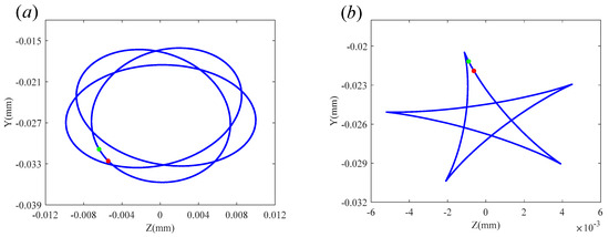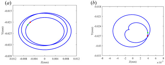 Axial trajectory diagrams of disk2 at different speeds when : (a) rpm and (b) rpm.