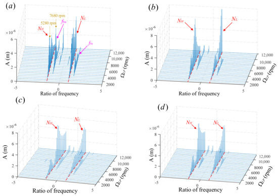 Full-spectrum waterfall diagram of the dual rotor with inter-shaft rub impact: (a) LP-compressor disk1, (b) LP-turbine disk2, (c) HP-compressor disk3, and (d) HP-turbine disk4.