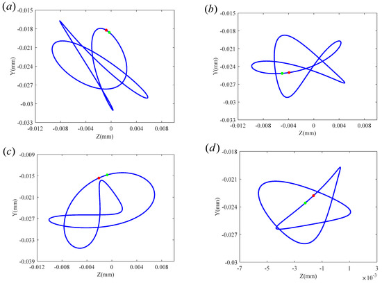 Axial trajectory diagrams of disk1 at different speeds with inter-shaft rub impact: (a) rpm, (b) rpm, (c) rpm, and (d) rpm.