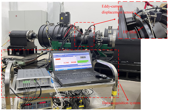 Using the existing laboratory facilities, experimental research was conducted on inter-shaft rub-impact faults under a constant rotational speed. Figure 20 shows the dual-rotor test rig with inter-shaft rub-impact faults. The highlighted section in the figure is the HP disk, corresponding to disk3 in the simulation model. An eddy-current displacement sensor is installed above the disk to capture the vertical vibration-displacement signal of the disk. The signal-acquisition system is located at the bottom left of the figure. Signals are stored in the computer via a data-acquisition device. The high-pressure rotor is driven by the motor through a belt. This test rig can only accommodate the operating condition of co-rotation of the HP rotor and LP rotor.