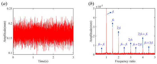 In Figure 21a, due to the presence of environmental noise and equipment interference during the experimental process, the fault characteristics in the time-domain plot are not very distinct. Performing an FFT transformation on the signal yields the frequency-domain plot shown in Figure 21b. In the frequency-domain plot, the main frequency components have been identified, including the rotational frequencies and of the LP rotor and HP rotor, as well as the combination frequencies and harmonics, such as , , , , , , and . The experimental results are in good agreement with the simulation results.