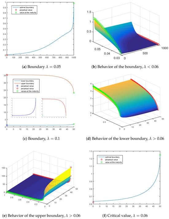 If the discount factor takes its critical value, , then we again have a one-sided optimal hitting problem. The main difference is that early exercising can be optimal even for the perpetual derivatives. The optimal boundary is presented in Figure 2f. The perpetual value is marked with a red circle, and it is , due to Equation (54). We can see that the optimal boundary tends namely to this level. Also, the maturity value is obtained via Formula (47), and it is —we again mark it with a green circle.