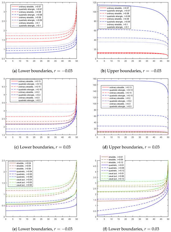 We provide a comparison between the optimal boundaries of the quadratic strangle options and the usual straddles. We consider two values for the risk-free rate—one positive and one negative. Suppose first that . As we mentioned above, the critical value for the discount factor at which the quadratic coefficient in (32) changes its sign is . We have a two-sided optimal stopping problem when —we consider the discount rate to be amongst . The optimal boundaries are presented in Figure 3a,b—the lower ones in Figure 3a and the upper ones in Figure 3b. We can see that the lower boundary of a quadratic strangle is below the corresponding boundary of the related straddle. The opposite is true for the upper boundaries—the boundary of the quadratic strangle is above the related straddle one. We can also see that for both style options, the smaller the discount factor is, the larger the lower optimal boundary is, and the smaller the upper one is. Note that in the asymptotic case , both boundaries tend to the strike, thus the optimal set turns to the singleton . Another observation we made is that the upper optimal boundary for the quadratic strangle increases relatively faster w.r.t. than the lower one decreases. Moreover, the upper boundary tends to infinity for discount rates near the critical value . This is due to the fact that when , the quadratic strangle leads to a one-sided first hitting task. Note that it is put-style in the sense that the optimal points are below the optimal boundary. Thus, the upper optimal boundary for the quadratic strangles vanishes. Next, we examine the tasks considering values of . Note that we need since . We present, in Figure 3e, the lower boundary of the usual straddle options as well as the unique quadratic one. We have to mention that it tends to zero for large maturities when . In contrast, its limit is positive when . This is in accordance with Theorem 2. In addition, we present the optimal boundary of the related ordinary American put. We can observe that the boundaries of the ordinary put and the straddle are relatively near. However, the put boundary is above the straddle one due to the right of the straddle being exercised as a call. In contrast, the boundary of the quadratic option is significantly below the put and straddle ones. This means that the quadratic option is the most expensive, the usual American is the cheapest, and the straddle is between them.