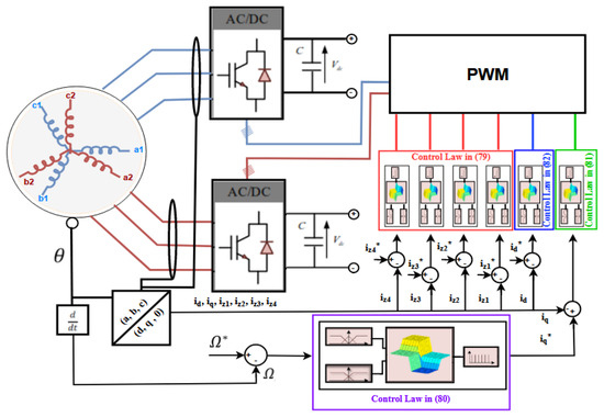 Our study focuses on a complex system, consisting of a permanent magnet synchronous machine with two stator windings. Each of these windings is powered by a three-phase inverter. To ensure the precise control of these two power electronic structures, we implemented adaptive fuzzy controllers, enabling the flexible and efficient management of the system in the presence of disturbances. The depicted system is illustrated in Figure 1.