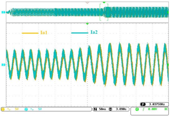 The Figure 8 illustrates the variation in the current in the first phase of the first star, as well as the first phase of the second star, with a zoom-in look at the current behavior at the moment when the electromagnetic torque changes from 60 Nm to 93 Nm. It should be noted that, at this moment, the current amplitudes increase from 7 A to 10 A.