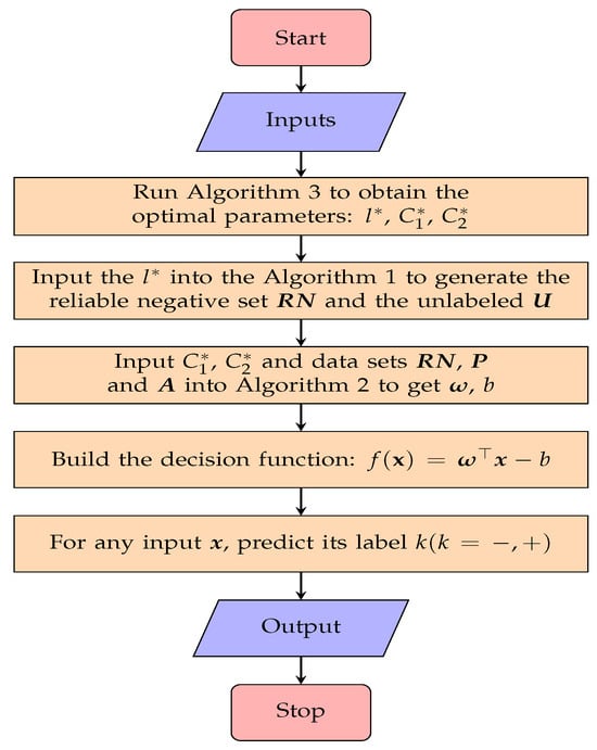 The complete AVI-SVM algorithm for the PU learning problem is given as Algorithm 4. Its flowchart is shown in Figure 1. For the input positive dataset and the unlabeled dataset , AVI-SVM first uses Algorithm 3 to obtain the optimal parameters , , and and then applies Algorithm 1 to obtain the reliable negative examples and the remaining unlabeled examples , followed by generating the and b required for the decision function by Algorithm 2. Finally, for any input example , it uses decision function to predict and return its class.