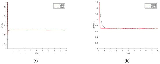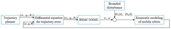In this section, in order to verify the effectiveness of the controller proposed in this paper, the comparative simulation experiment between BSMC, NSMC and PID utilized MATLAB/SIMULINK as the primary platform. The control structure of the wheeled mobile robot is depicted in Figure 3.