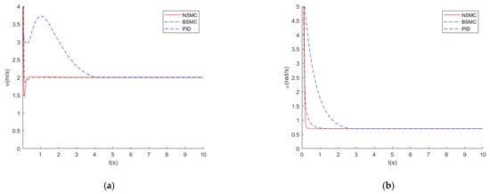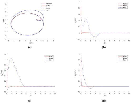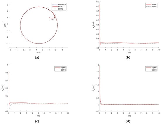 Their comparative simulation results are shown in Figure 4 and Figure 5. The results illustrate that both controllers can effectively track the trajectory and converge the trajectory error. The two controllers exhibit quicker convergence and achieve greater accuracy in convergence compared to the PID controller. In contrast to BSMC, NSMC can converge faster on the systematic errors , , but the systematic error converges slower than BSMC. The primary distinction between NSMC and BSMC lies in the configuration of the sliding mode surface (Equations (6), (7), (17), and (18)), with different sliding mode surfaces significantly affecting the error convergence process. The design of the sliding mode surface continues to hold considerable importance for its functionality. The simulation results indicate that both BSMC and NSMC have good fast trajectory tracking control capability.