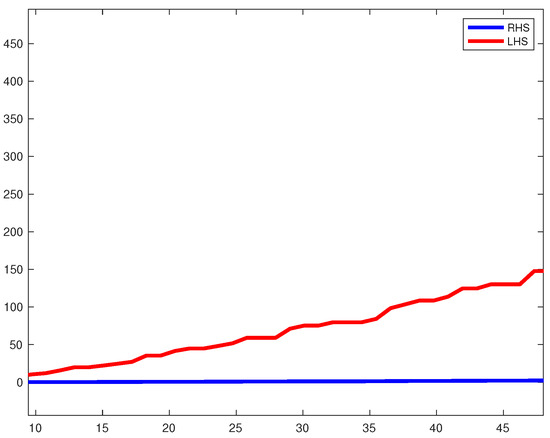 Thus, all the necessities of Theorem 1 have been accomplished. Also, the behavior of inequality (7) of Example 4 is shown graphically in Figure 2. The number 0 is the only fixed point that is common to the mappings , and .