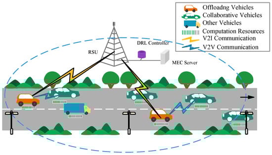 Several computation offloading approaches have been proposed to mitigate the aforementioned problems. Zhang [2] proposed a multilayered edge computing scheme in which backup computing servers were added between MEC servers and the problem of pricing for offloading computation to MEC and backup computing servers was transformed into a Stackelberg game. Guo et al. [3] constructed a cloud–MEC collaborative computation offloading scheme based on a fiber–wireless (FiWi) network. The offloading time to the cloud was reduced via the FiWi connection, and task loads offloaded to the MEC servers and the cloud were balanced using a game theory-based method. In addition, several research studies [4] employed idle resources in Unmanned Aerial Vehicles (UAVs) as a supplement to edge computing servers for the efficient use of resources and to provide reliable service. However, the existing schemes face several challenges. Deploying additional MEC servers or UAVs incurs additional costs and leads to resource underutilization during periods of low network load. Simultaneously, intelligent vehicles in a VEC environment possess increasingly powerful computing capabilities, yet existing schemes largely neglect this valuable resource.
