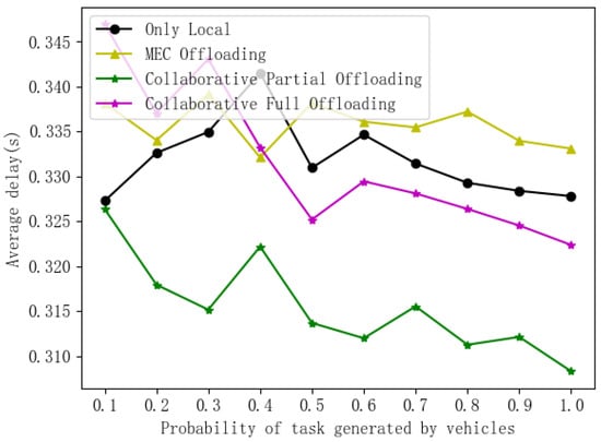 Comparison of average delays under different task generation probabilities.