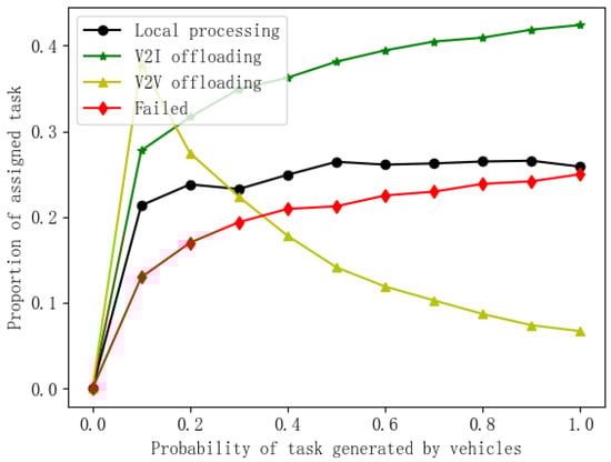 Figure 6 reveals how the probability of a vehicle generating a task influences task allocation in our scheme. As this probability increases, the proportion of tasks offloaded to collaborative vehicles decreases. At the same time, the proportions of tasks executed locally and offloaded to MEC servers are higher than those of CV offloading and failures. The reasons are twofold: First, in high-speed scenarios, OVs might move out of the communication range before receiving the results of tasks offloaded to MEC servers or CVs. This limits the feasibility of offloading at higher speeds. Second, with an increasing task generation probability, the total number of tasks in the system grows but the MEC server’s resources and the number of suitable CV candidates remain constant. This increased workload strains the MEC server and the limited pool of CVs, making offloading less successful.