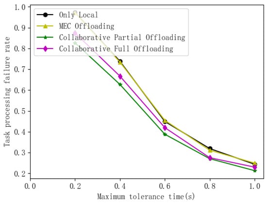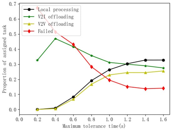 From Figure 7, we can observe that the rate of task failures drops as the maximum tolerable time increases because the relaxed delay requirement alleviates pressure on MEC servers and CVs. Furthermore, the proportion of local processing and V2V offloading increases. This is because even with limited computational resources, CVs can potentially meet relaxed deadlines for tasks with higher tolerable delays, making local processing or offloading to OVs more viable.