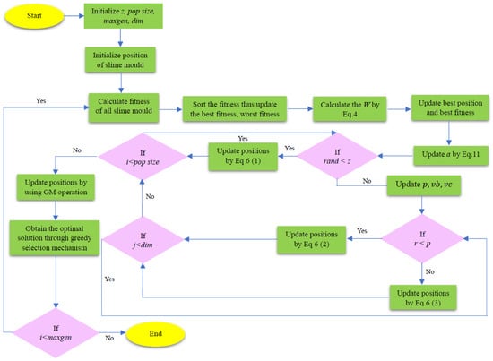 The pseudocode of SMA-GM illustrates how the proposed method reconsiders the position details following the original algorithm’s search for a feasible outcome. The above-mentioned technique not only broadens the population’s diversity but also boosts the effectiveness of the search process; in the process, the enhanced version keeps the original algorithm’s structure relatively straightforward. SMA-GM consists of the subsequent parts for complexity, such as initialization, fitness evaluation, sorting, weight update, position update, Gaussian mutation, and greedy search. Among them, represents the number of slime mould, represents the dimension, and represents the maximum number of iterations. The total complexity of SMA-GM is . Figure 1 presents the flowchart of the SMA-GM algorithm.