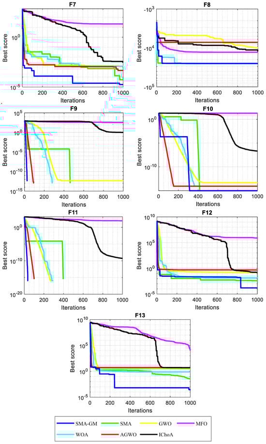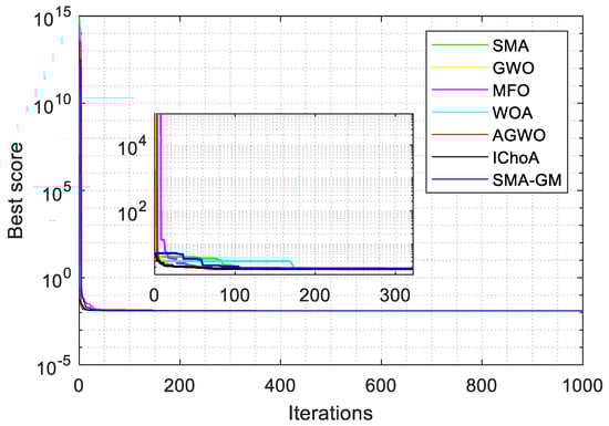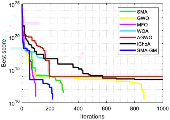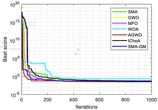 Table 3 displays the results of the unimodal and multimodal test functions. According to the experimental findings, SMA-GM performs better in most of the test functions. Most notably, SMA-GM achieved satisfactory results in both low and high dimensions for the unimodal functions (F1–F7). In all three dimensions, SMA-GM is able to consistently achieve the theoretically optimal solutions for F1 and F3. In comparison, the other comparable algorithms are not very capable of achieving the theoretical optimal value in all the test functions and perform weaker than SMA-GM. Comparing the test results of each dimension, the results show that the SMA-GM’s performance has not dropped too much with increasing dimensions, which illustrates that SMA-GM has outstanding local exploitation capability. For the multimodal functions (F8–F13), the SMA-GM steadily achieves the theoretical optimal values at F9–F11 in all three dimensions (30, 60, and 200). SMA-GM has the overall best performance in the multimodal functions, signifying that the improved algorithm extensively boosts the global exploration capability of SMA.