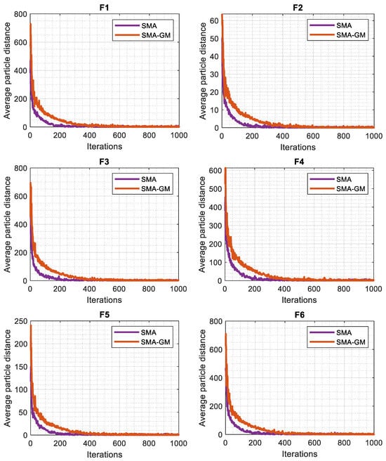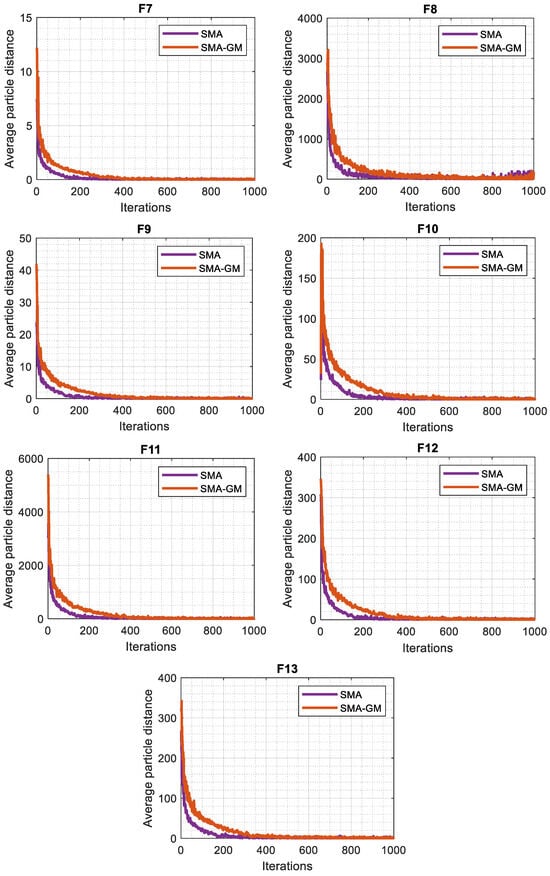 The diversity in each dimension is defined as the distance between the dimension of each search agent and the average median of the dimension. The variation in diversity between the original SMA and SMA-GM is shown in Figure 3. The average distance between the search agents is displayed on the vertical axis, while the number of iterations is displayed on the horizontal axis. Because of the random initialization process, it is evident that both algorithms reflect high diversity in the initial phase of the execution. Then, as a result of various algorithmic operations, the diversity varies. As the iterations increase, the search agents traverse the whole search space and the average distance gradually becomes smaller, making the diversity decrease, and the algorithms gradually go into the exploitation phase, which is consistent with the above analysis. However, in most of the test functions, the average distance in each iteration is high for the SMA-GM algorithm as compared to SMA, which shows the better ability of search in the SMA-GM in terms of exploring new search regions of the search space. This shows the effect of improving the search mechanism of slime moulds through the GM strategy in the SMA-GM algorithm.
