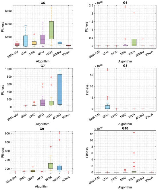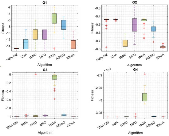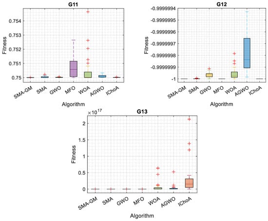Considering 13 commonly used constrained benchmark functions, the proposed SMA-GM’s capability to handle constrained problems was evaluated. Table 4 shows the different linear, non-linear, and quadratic equations for each problem in the set that take the form of equality and inequality constraints. Table 5 illustrates the results for each constrained benchmark function employed with SMA-GM and other algorithms. The results clearly illustrate that SMA-GM outperforms all other algorithms for 10 of the 13 constrained benchmark functions with excellent efficiency, showing the superiority of the proposed algorithm. IChoA outperformed SMA-GM in the G2 problem; in the G8 problem, SMA-GM performed better than SMA but could not outperform the other algorithms for the G8 problem and for the G5 problem, IChoA performed better than SMA-GM. For problem G11, compared with SMA, GWO, and IChoA, SMA-GM obtained similar results and for the G12 problem, SMA-GM, MFO, and IChoA acquired identical results. The algorithm has produced satisfactory results, either optimal or nearly optimal. According to the results, the proposed Gaussian mutation (GM)-based SMA-GM outperforms the competitive metaheuristic techniques in terms of solution accuracy except for the G2, G5, and G8 problems. Boxplots in Figure 4 strengthen the conclusion mentioned above. The SMA-GM algorithm demonstrates excellent robustness for handling constrained problems, as evidenced by the lowermost position and least height of the box, which is plotted by the obtained outcomes.