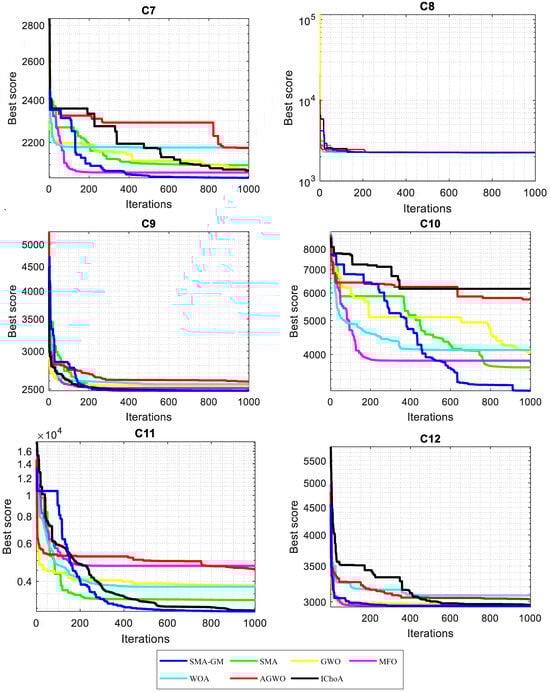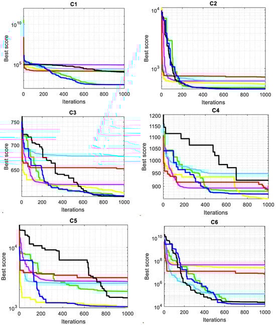 As seen in Figure 5, the convergent graphs are extracted from the CEC2022 test functions to thoroughly validate the SMA-GM algorithm’s performance. The convergence curve shows that whereas other algorithms enter local optima too early, SMA-GM has a faster rate of convergence in the functions C1–C3 and C6–C12. In order to prevent stagnation into local minima, SMA-GM’s performance first explored the majority of the search space. Later, it gradually switched to the exploitation operator to quickly reduce diversity during the second half of the optimization process, speeding convergence toward the most promising region so far found. Due to the search process variation, the SMA-GM performs well, which allows the algorithm to have a strong exploration and exploitation operator during the optimization process. The GM operator helps to preserve population diversity, prevents the system from becoming stuck in local optima, and speeds up the convergence towards the best-so-far solution.