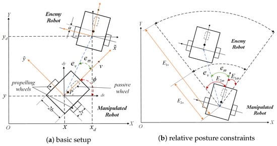 where and are the linear velocity and angular velocity of the target enemy, respectively. The desired posture of the enemy robot can be expressed as .