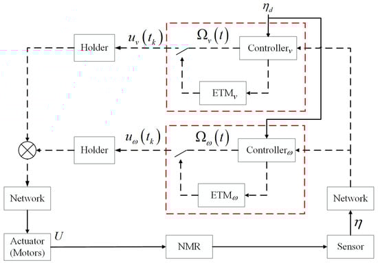 where , , , ; represents the measurement error; represents the intermediate control law, which would be designed later; denotes the triggering moment, and . The diagram that illustrates how ETM works in the control framework is shown in Figure 2.