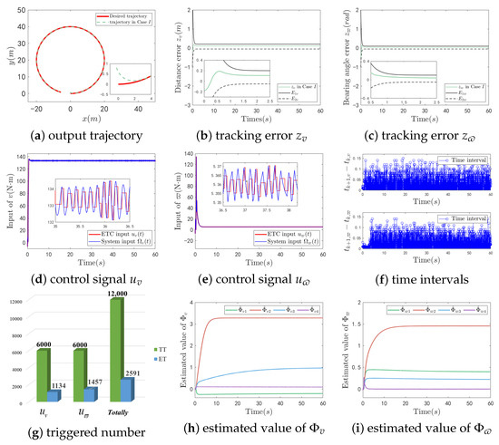As shown in Figure 6a and Figure 7a, the robots are capable of convergence to the desired trajectory. Figure 6b,c and Figure 7b,c depict that the relative distance error and bearing angle error could rapidly converge into a specified asymmetric region within 1 s and 0.8 s, respectively. In Figure 7d,e, it is shown that the ETM makes great contributions for the input signals to ease the burden of communication channels. Statistically, from Figure 7f,g and Table 7, at least 63.020% of communication resources can be preserved. Figure 7h,i depict that the estimated values of both and are bounded. From the aforementioned analysis, it is obvious that the results of Example 2 are quite similar to Example 1. That is, the proposed control scheme can practically guarantee the system performance while the system achieves fixed-time convergence under asymmetric constraints.