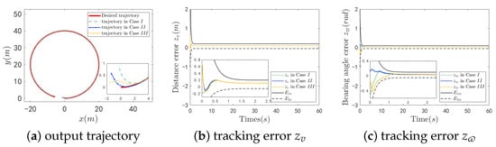 The system’s initial conditions are presented as Cases I, , and in Table 2. The parameters of relative posture are given in the first line of Table 3. The designed parameters are shown in the second line of Table 3. It is worth pointing out that the relative distance and bearing angle constraints consisting of (8)–(10) would never be violated when Equations (12) and (13) hold. Thus, the parameters of PPF are selected in the third line of Table 3 for better convergence property of the tracking error system (11). In addition, the parameters related to ETM are given in the last line of Table 3.