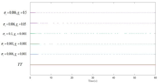 Considering the triggered threshold of the ETM, it can be seen that the variables and show positive correlation with the threshold. That is, by increasing or , the triggered threshold would be increased, then the triggered number would be reduced and the triggered intervals would be longer. Simultaneously, it can be deduced that a smaller threshold could have more precise control applied to the system, then better system performance can be obtained. Referring to the above regulation, which is shown in Figure 5, we can choose appropriate triggered parameters to balance system performance and communication resources occupation.