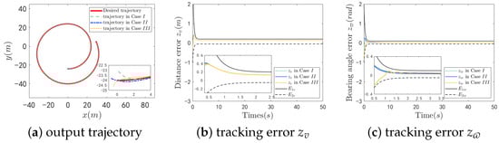 The system’s initial conditions are presented as Cases I, , and in Table 5. Similar to Example 1, the parameters of relative posture, the parameters of controllers, the parameters of PPF, and the parameters of ETM are presented in Table 6. In addition, the tracking effect comparison among Cases I, , and is given in Figure 6.