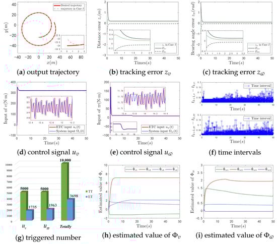 The simulation results are presented in Figure 3. According to Figure 3, the proposed tracking control scheme is instrumental for a type of NMR with asymmetric relative distance and bearing angle constraints. Figure 3a displays the enemy’s reference trajectory and real trajectory (robot’s output trajectory), which show an ideal performance that the robot can effectively dislodge the target under a certain trajectory. Figure 3b,c show the tracking error of relative distance and bearing angle, respectively. It is obvious that all the tracking errors converge into a predefined region given by PPF in a short time and never break away from the bounded area. Next, the curve of control torque input applied about the linear and angular axis are depicted in Figure 3d,e, respectively. It is worth pointing out that the blue curve represents the system’s original input and the red one is the input under the event-triggered mechanism (ETM). Accordingly, we can obtain that the control torque inputs are bounded. The triggered time intervals are given in Figure 3f, which depicts that the maximal triggered time intervals of and are 0.15 s and 0.14 s, respectively. Figure 3g and Table 4 reveal that the ETM reduces the triggered number to conserve communication resources, as the total triggered numbers based on the time-triggered mechanism (TTM) and ETM are 12,000 and 2591, respectively. That is, 78.408% of communication resources are successfully conserved by introducing ETM into the channel from the controller to the actuator. In Figure 3h,i, the estimated values of and , respectively, are given and successfully verify that and are bounded parameters.