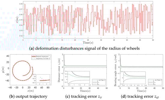 In the actual application process of the NMR, the wheels tend to be affected by road conditions, which would lead to various deformation of the wheels, and then the radius of the wheels would correspondingly change. Therefore, a deformation disturbance signal of the radius of wheels is introduced into Example 2 to further simulate the actual application process of the NMR under wheel deformation. As shown in Figure 8a, the elements of signal are randomly selected from the range .
