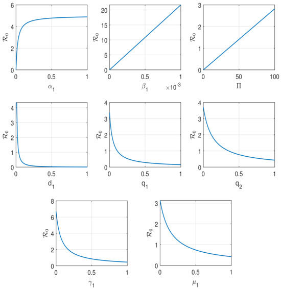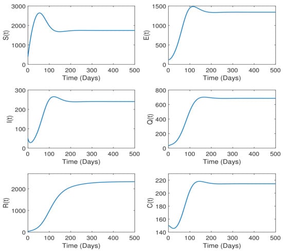 Since and , it follows that S(t) ≥ 0 . We can also demonstrate this positivity for other state variables of the model Equations (3)–(7). □