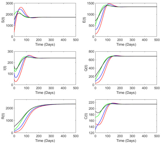 Since the state variable is continuously differentiable for , the function and its first partial derivative are also continuous there. Moreover, the boundedness of is given by Theorems 1 and 2. Now, to prove Lipschitz’s condition on , we only need to show that the derivatives are bounded.