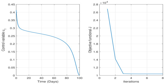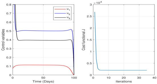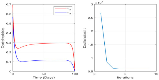 Here, we present and discuss the results obtained by solving the necessary optimality conditions by following the steps described in the aforementioned algorithm. For numerical simulation of state and adjoint equations, we subdivide the time domain into n intervals, each of size , and discretize the equations at the points using the RK4 method. The integral for the cost functional (37) is approximated by using Simpson’s rule.