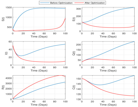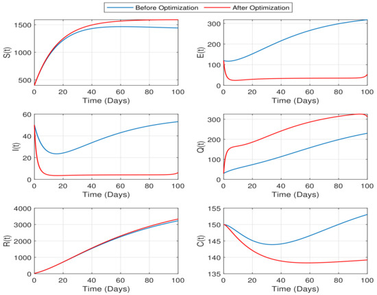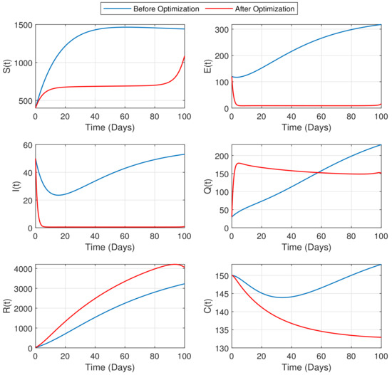 Case 2: In this case, our focus is to quarantine the optimal number of exposed and infected trees to minimize the infection. To implement this strategy, we take and consider the rate of fungicide spray, , as a constant initialized to the value 0.03. However, the other control variables are considered time-dependent functions. Figure 8 and Figure 9 display the best solutions to problem (38) under these circumstances.